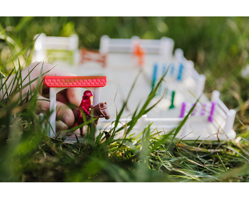 1 tablero de juego, 1 puerta de salida, 10 losetas con obstáculos, 1 jinete con caballo, 1 libro de desafíos.